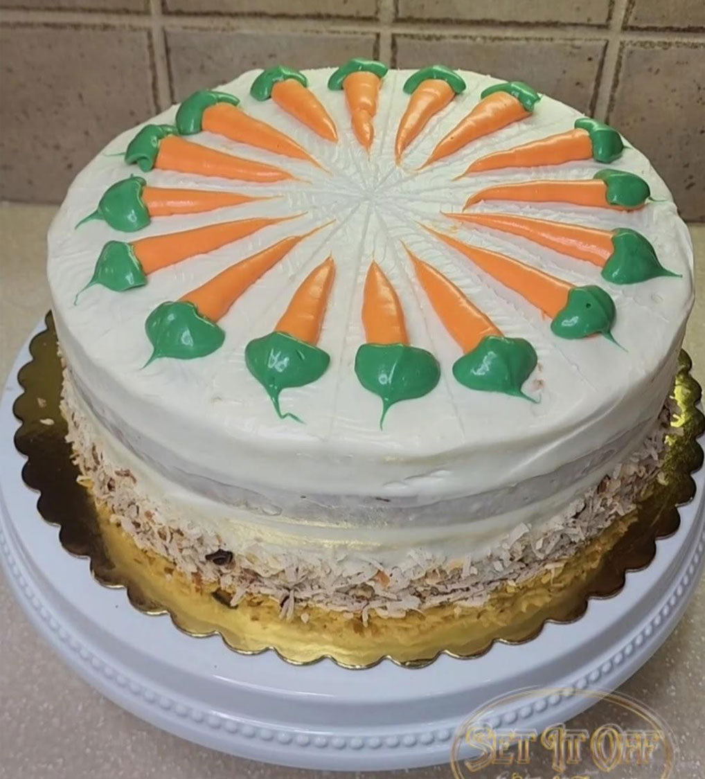 This is a rich, four-layered, luscious carrot cake. Every bite is loaded with flavor. At its base are carrots, pineapple, coconut flakes, raisins, and pecans with a blend of spices that elevate the flavor profile. It is then iced with a signature cream cheese frosting. This cake is 4 inches to 5 inches tall.