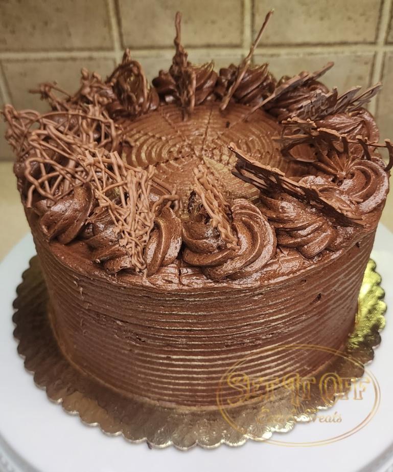 This chocolate cake has four layers with rich, chocolate buttercream that melts in your mouth and is finished with stylish, milk chocolate decorations. This cake is 4.5 inches to 5.5 inches tall.