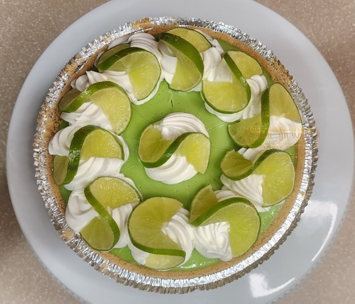 This pie is filled with a lush key lime filling that is made from scratch and has a graham cracker crust. It has a refreshing citrus flavor and a texture that is smoother than butter.
