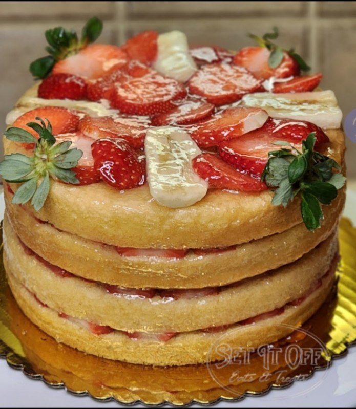 This is a four-layered, butter vanilla cake with freshly sliced strawberries and bananas between each layer. It is then glazed with our homemade finishing glaze that enhances the flavor profile.