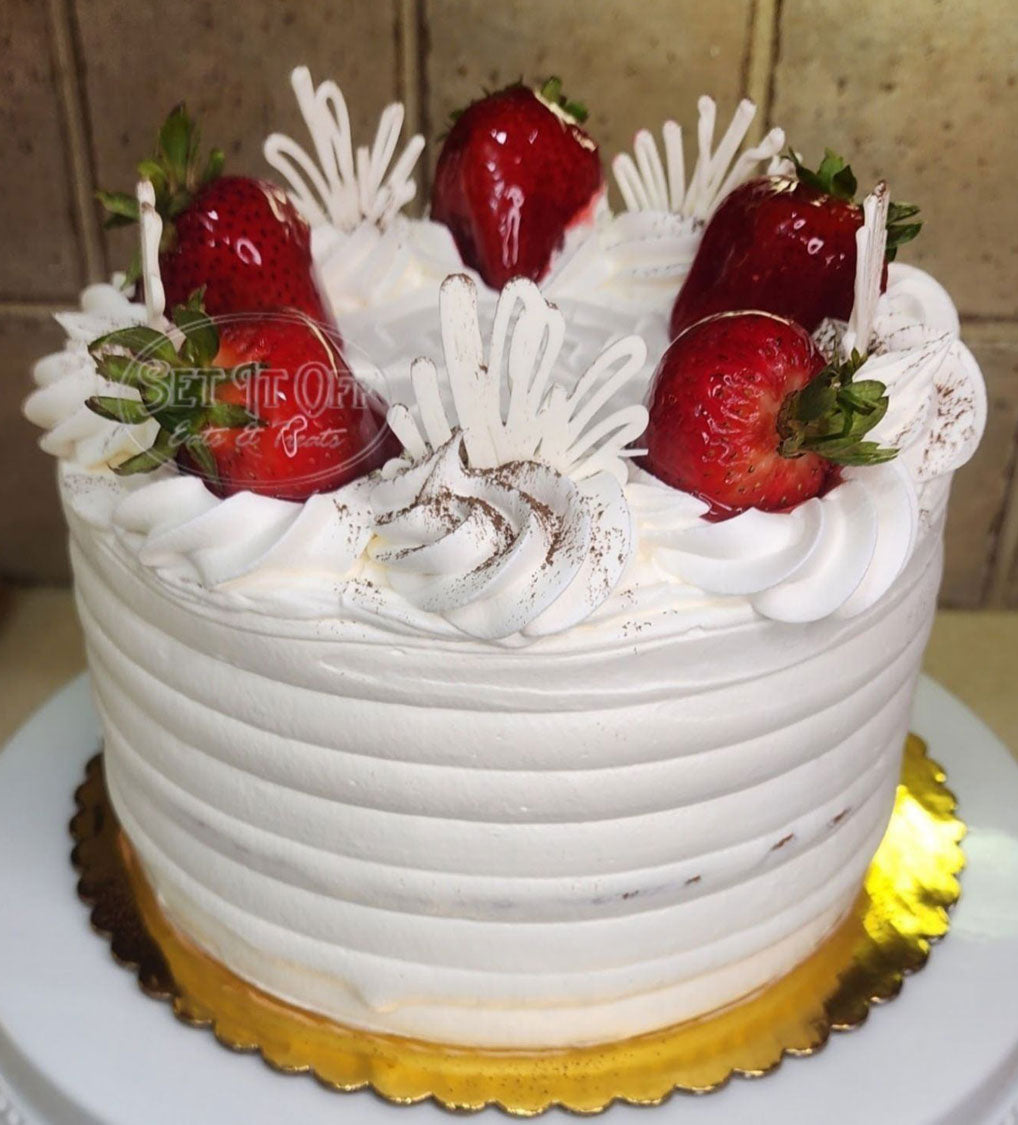 A naturally moist cake with a strawberry flavor and is refreshingly light with homemade strawberry creme filling and white chocolate pieces in between two layers with a third layer of strawberry filling.