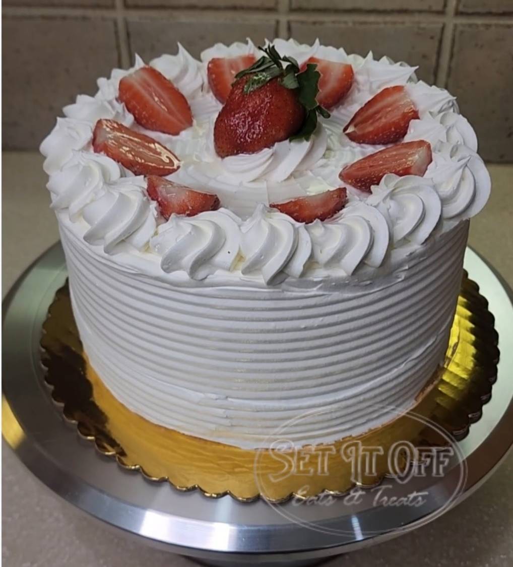 This strawberry-flavored cake is incredibly moist. The four-layered cake holds strawberry filling between each layer and is finished with whipped topping and fresh strawberry pieces. This cake is 4.5 inches to 5.5 inches tall.